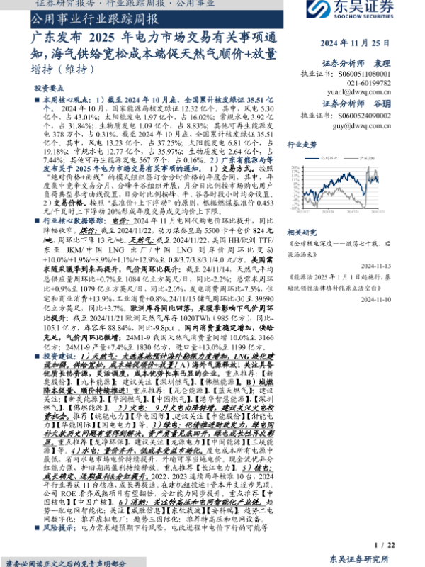 【东吴证券】【20241125】公用事业行业跟踪周报:广东发布2025年电力市场交易有关事项通知,海气供给宽松成本端促天然气顺价+放量-22页 行业研究