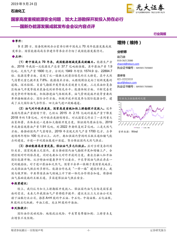 【光大证券】【20190924】国新办能源发展成就发布会会议内容点评:国家高度重视能源安全问题,加大上游勘探开发投入势在必行-2页 行业研究