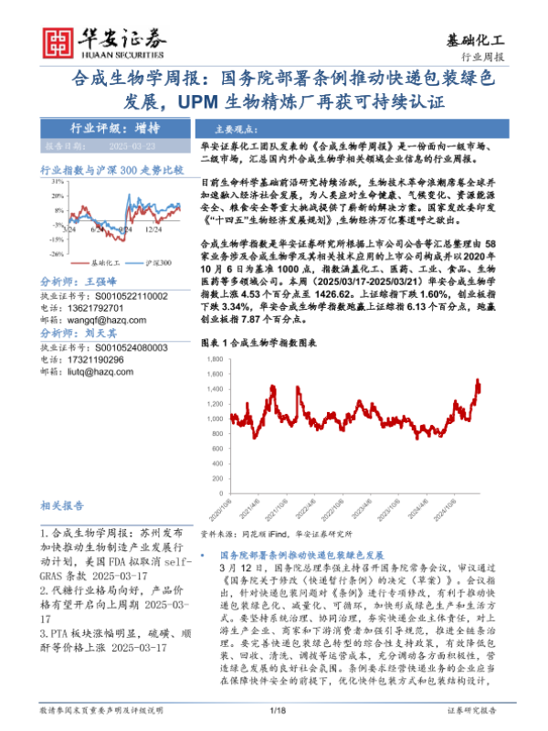 【华安证券】【20250323】合成生物学周报:国务院部署条例推动快递包装绿色发展,UPM生物精炼厂再获可持续认证-18页 行业研究