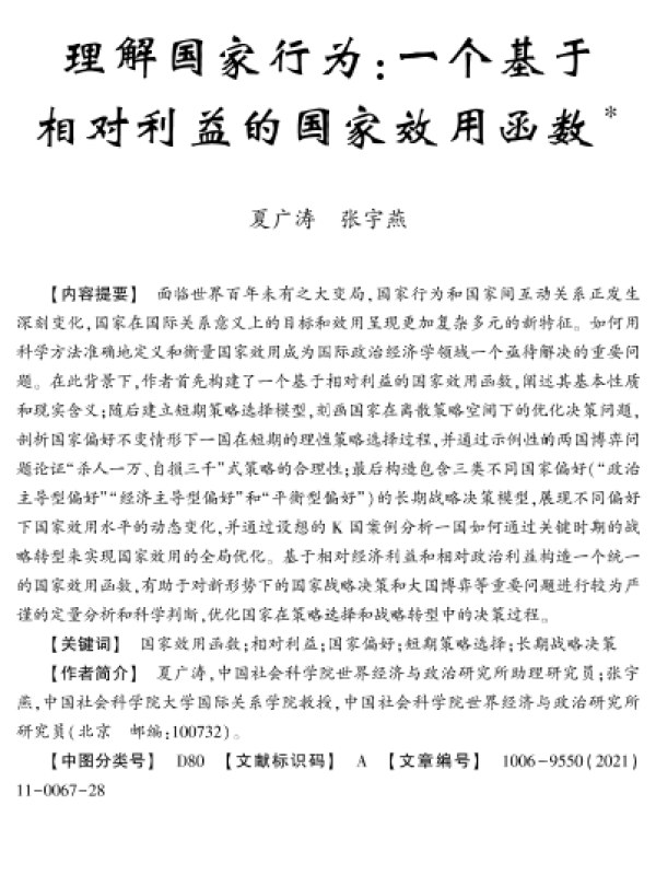 【中国社科院】【2021】理解国家行为:一个基于相对利益的国家效用函数-28页 学术论文