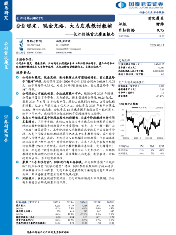 【国泰君安证券】【20240613】长江传媒(600757)首次覆盖报告:分红稳定、现金充裕,大力发展教材教辅-23页 行业研究