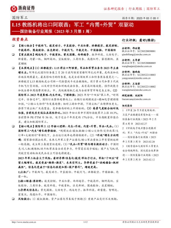 【浙商证券】【20230305】国防装备行业周报(2023年3月第1周):L15教练机将出口阿联酋;军工“内需+外贸”双驱动-12页 行业研究