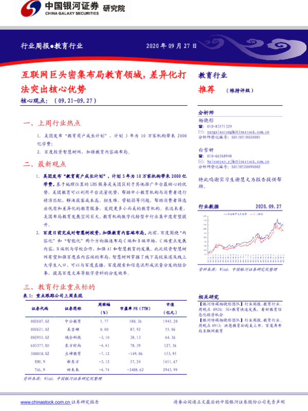 【银河证券】【20200927】20200927-中国银河-教育行业周报:互联网巨头密集布局教育领域,差异化打法突出核心优势-18页 行业研究