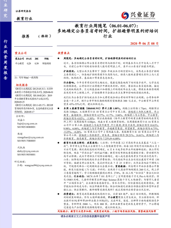 【兴业证券】【20200608】教育行业周随笔(06.01-06.07):多地确定公务员省考时间,扩招趋势明显利好培训行业-19页 行业研究