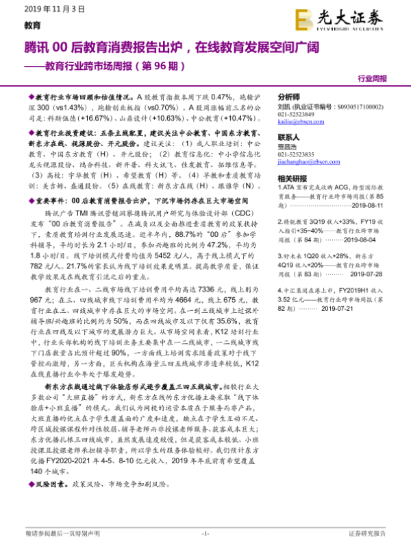 【光大证券】【20191103】教育行业跨市场周报(第96期):腾讯00后教育消费报告出炉,在线教育发展空间广阔-13页 行业研究