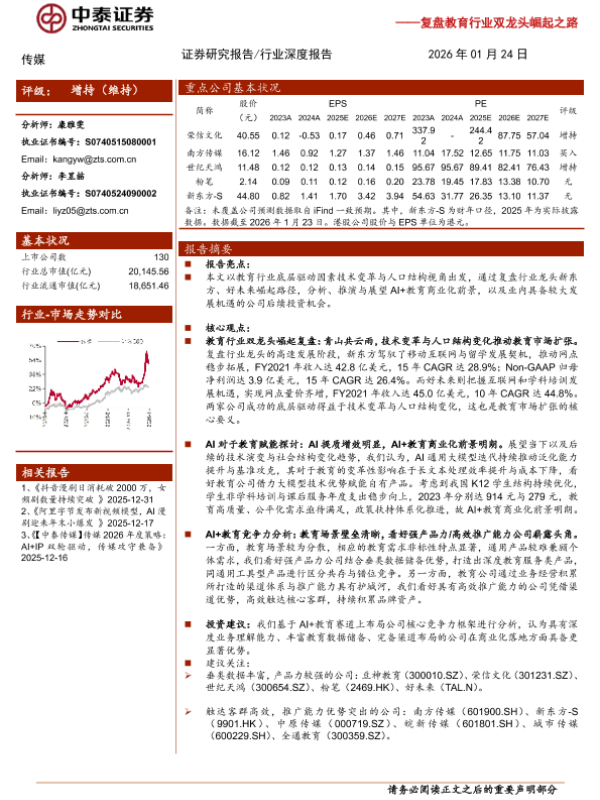 【中泰证券】【202601】复盘教育行业双龙头崛起之路:AI+教育深度报告:技术人口双轮驱动,AI+教育商业破局-34页 证券期货研究报告