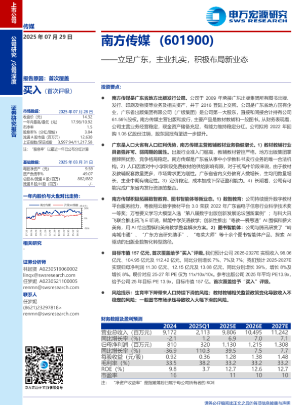 【申万宏源】【202507】南方传媒(601900)——立足广东,主业扎实,积极布局新业态-22页 公司研究