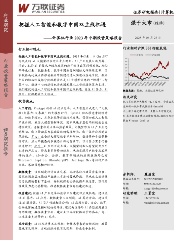 【万联证券】【20230627】计算机行业2023年中期投资策略报告:把握人工智能和数字中国双主线机遇-36页 行业研究