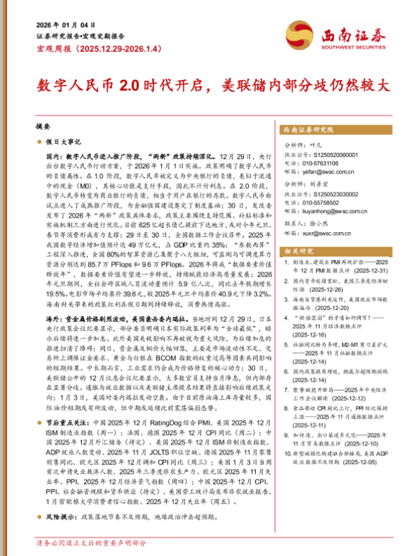 【西南证券】【202601】数字人民币2.0时代开启,美联储内部分歧仍然较大-10页 证券期货研究报告