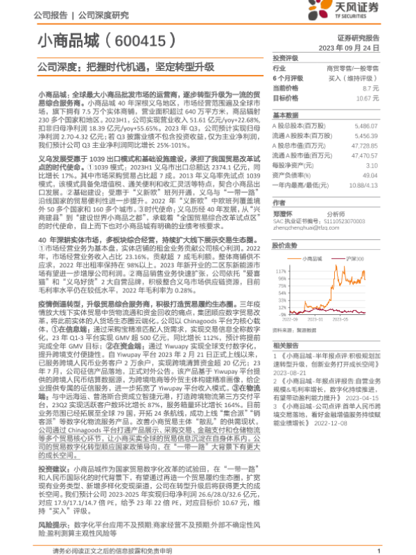 【天风证券】【20230924】小商品城-600415.SH-公司深度:把握时代机遇,坚定转型升级-31页 行业研究
