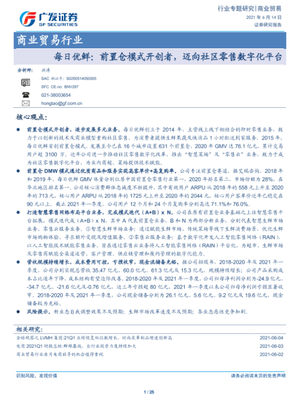 【广发证券】【20210614】每日优鲜:前置仓模式开创者,迈向社区零售数字化平台-25页 行业研究