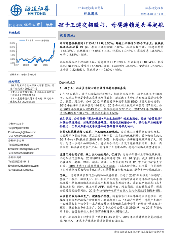 【海通证券】【20200719】商业贸易行业周报:孩子王递交招股书,母婴连锁龙头再起航-8页 行业研究