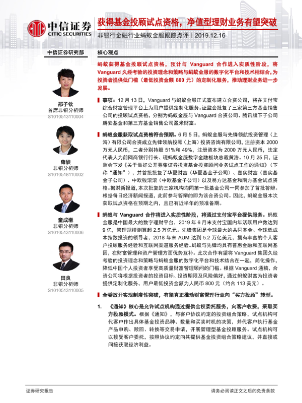 【中信证券】【20191216】非银行金融行业蚂蚁金服跟踪点评:获得基金投顾试点资格,净值型理财业务有望突破-6页 行业研究