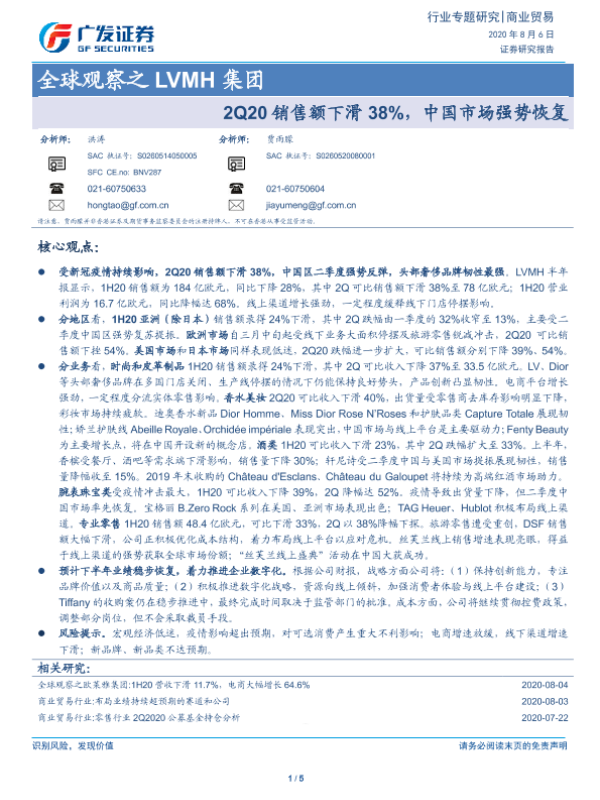 【广发证券】【20200806】全球观察之LVMH集团-2Q20销售额下滑38%,中国市场强势恢复-5页 行业研究