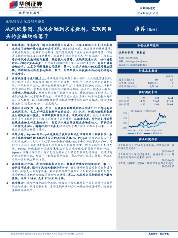 【华创证券】【20200917】互联网行业深度研究报告:从蚂蚁集团、腾讯金融到京东数科,互联网巨头的金融战略落子-38页 行业研究