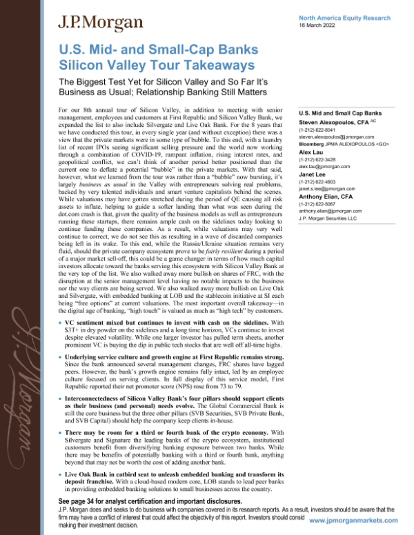 【J.P. Morgan】【20220316】J.P. 摩根-美股中小型银行业-硅谷之旅要点:这是硅谷迄今为止面临的最大考验,一切照旧-38页 行业研究