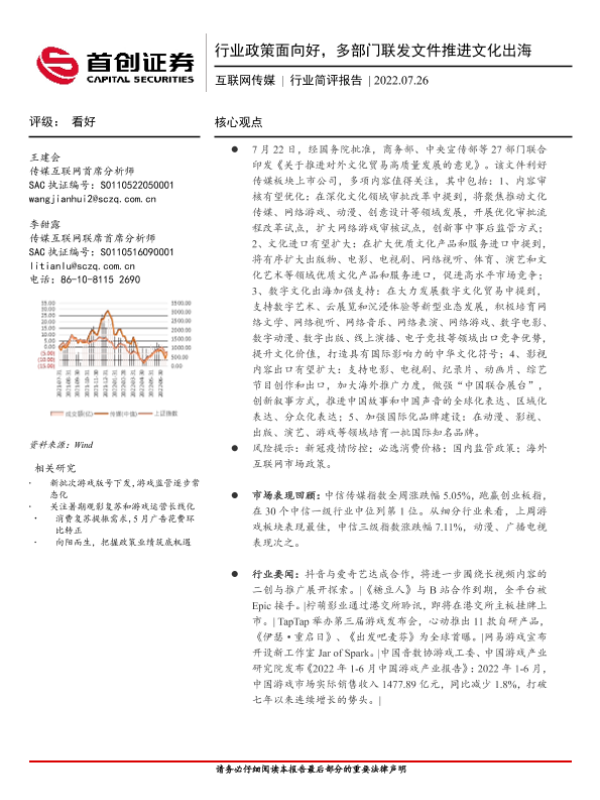 【首创证券】【20220726】互联网传媒行业简评报告:行业政策面向好,多部门联发文件推进文化出海-13页 行业研究