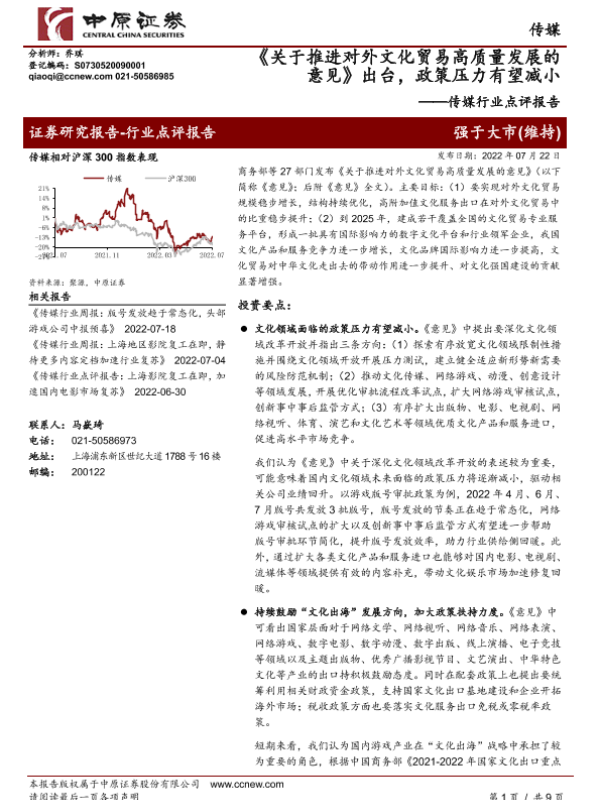 【中原证券】【20220722】关于推进对外文化贸易高质量发展的意见出台,政策压力有望减小-9页 行业研究