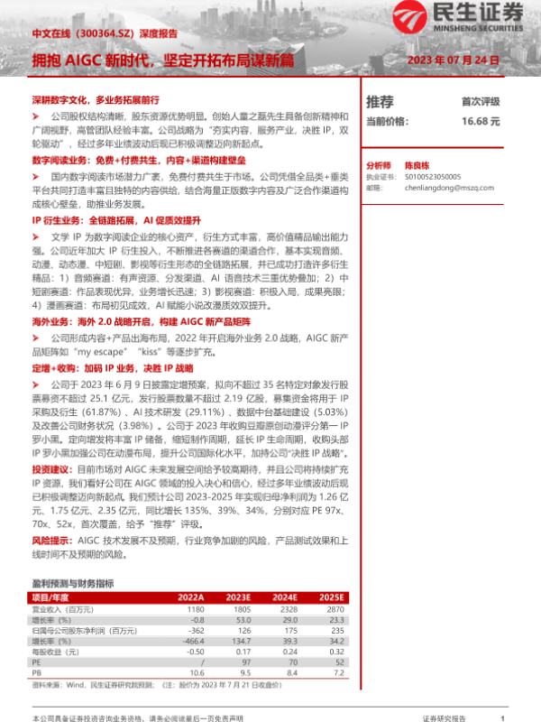 【民生证券】【20230724】20230724-民生证券-中文在线-300364.SZ-深度报告:拥抱AIGC新时代,坚定开拓布局谋新篇-31页 行业研究