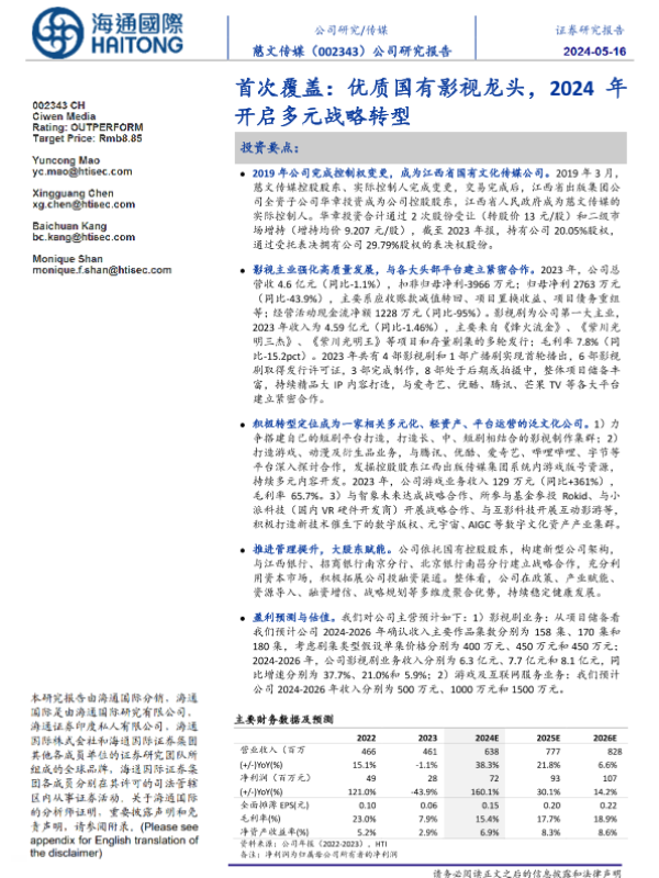 【海通国际】【20240514】慈文传媒-002343.SZ-首次覆盖:优质国有影视龙头,2024年开启多元战略转型-13页 行业研究