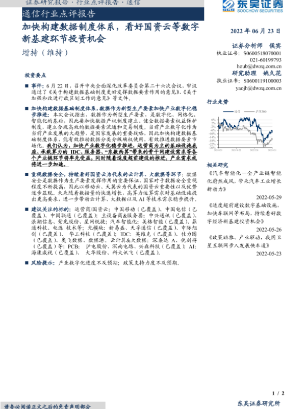 【东吴证券】【20220623】加快构建数据制度体系,看好国资云等数字新基建环节投资机会-2页 行业研究
