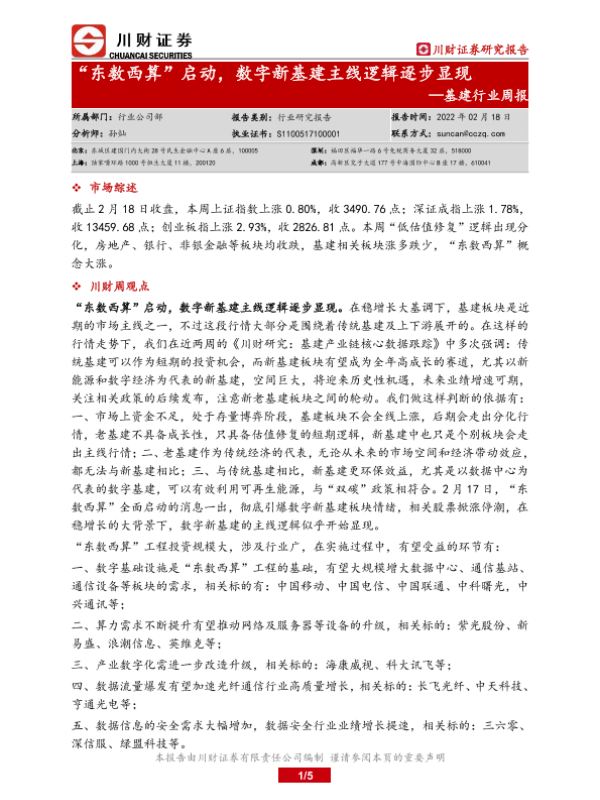 【川财证券】【20220218】基建行业周报:“东数西算”启动,数字新基建主线逻辑逐步显现-5页 证券期货研究报告