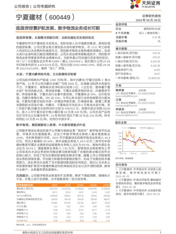 【天风证券】【20240908】宁夏建材(600449)强国资背景护航发展,数字物流业务成长可期-19页 行业研究