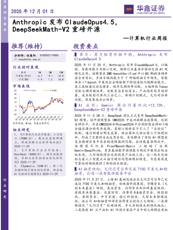 【华鑫证券】【202512】计算机行业周报:Anthrop ic发布 C laudeOpus4.5, DeepSeekMath-V2重磅开源-19页 证券期货研究报告