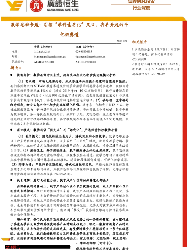 【广证恒生】【20190809】数学思维专题:引领“学科素质化”风口,冉冉升起的千亿级赛道-24页 行业研究