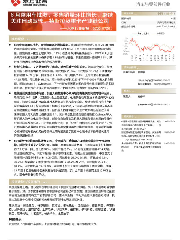 【东方证券】【20230709】20230709-东方证券-汽车行业周报:6月乘用车批发、零售销量环比增长,继续关注自动驾驶、特斯拉及重卡产业链公司-17页 行业研究
