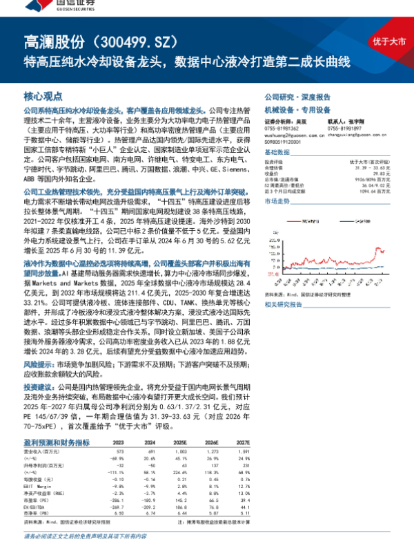 【国信证券】【202509】高澜股份(300499)特高压纯水冷却设备龙头,数据中心液冷打造第二成长曲线-25页 证券期货研究报告