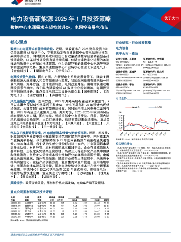 【国信证券】【202501】电力设备新能源行业2025年1月投资策略:数据中心电源需求有望持续升级,电网投资景气依旧-20页 行业研究