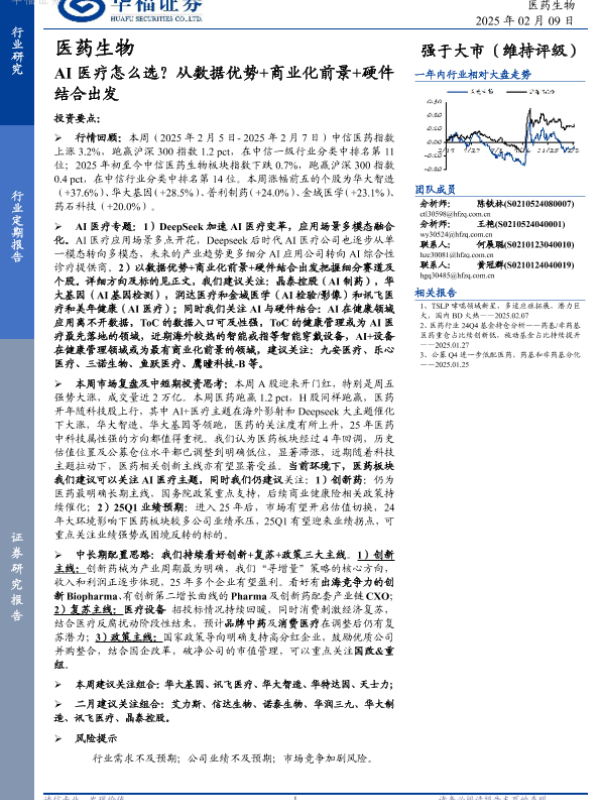 【华福证券】【20250209】医药生物行业定期报告:AI医疗怎么选?从数据优势+商业化前景+硬件结合出发-16页 行业研究