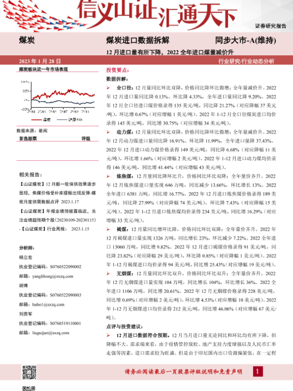 【山西证券】【20230128】煤炭进口数据拆解:12月进口量有所下降,2022全年进口煤量减价升-12页 行业研究