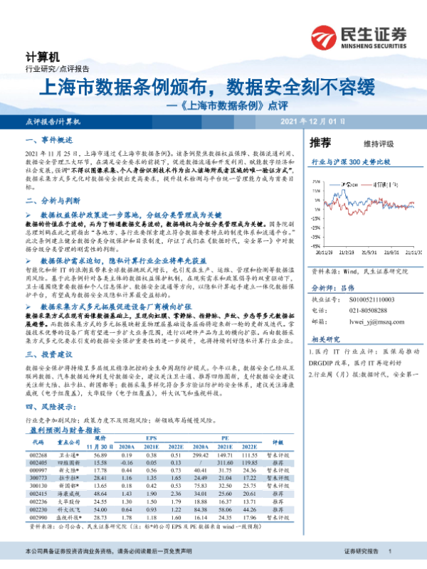 【民生证券】【20211201】20211201-民生证券-计算机《上海市数据条例》点评:上海市数据条例颁布,数据安全刻不容缓-3页 行业研究