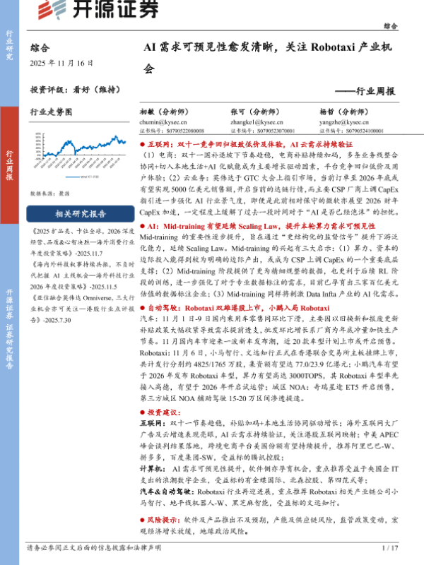 【开源证券】【202511】AI需求可预见性愈发清晰,关注Robotaxi产业机会——行业周报-17页 证券期货研究报告