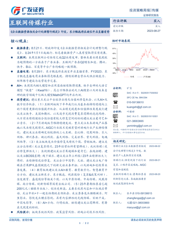 【广发证券】【20230827】互联网传媒行业投资策略周报:企业数据资源相关会计处理暂行规定印发,东方甄选将在淘宝开启直播首秀-22页 行业研究