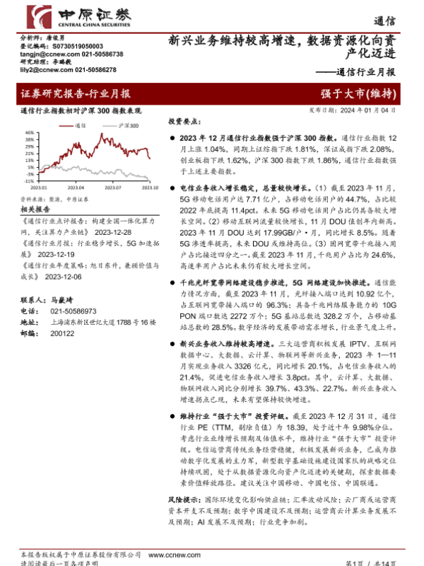 【中原证券】【20240104】通信行业月报:新兴业务维持较高增速,数据资源化向资产化迈进-14页 行业研究