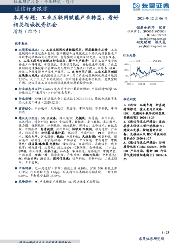 【东吴证券】【20201206】通信行业本周专题:工业互联网赋能产业转型,看好相关领域投资机会-23页 行业研究