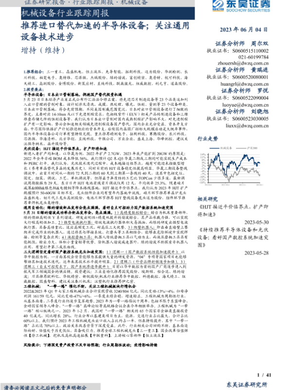 【东吴证券】【20230604】20230604-东吴证券-机械设备行业跟踪周报:推荐进口替代加速的半导体设备;关注通用设备技术进步-41页 行业研究