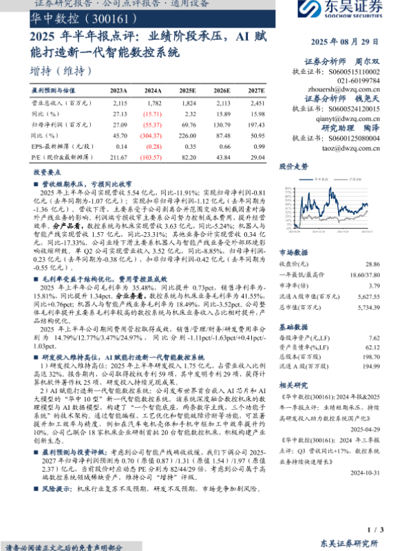 【东吴证券】【20250829】华中数控-2025年半年报点评:业绩阶段承压,AI赋能打造新一代智能数控系统-3页 证券期货研究报告