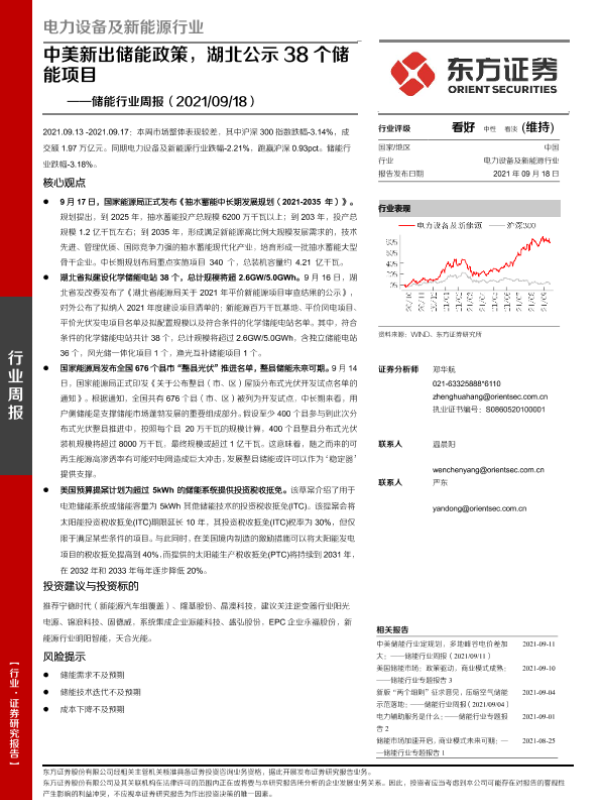 【东方证券】【20210918】20210918-东方证券-储能行业周报:中美新出储能政策,湖北公示38个储能项目-21页 行业研究