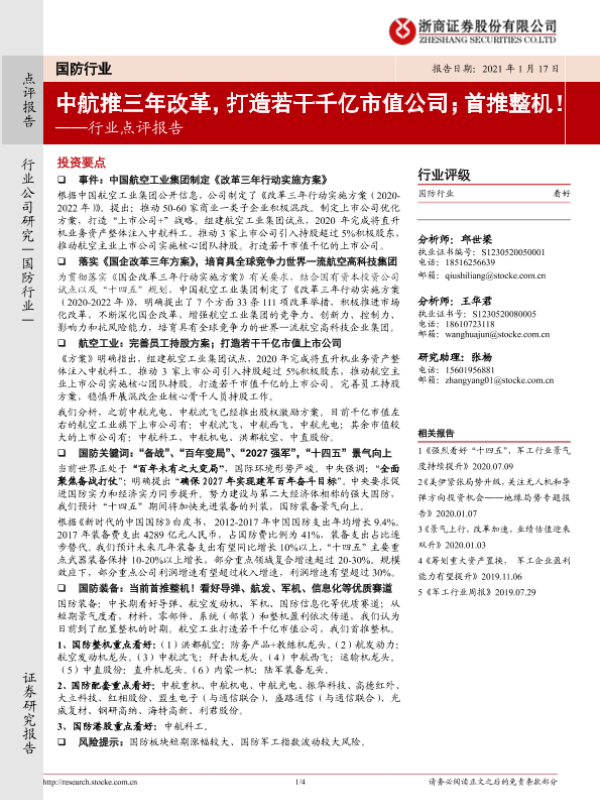 【浙商证券】【20210117】国防行业点评报告:中航推三年改革,打造若干千亿市值公司;首推整机!-4页 行业研究