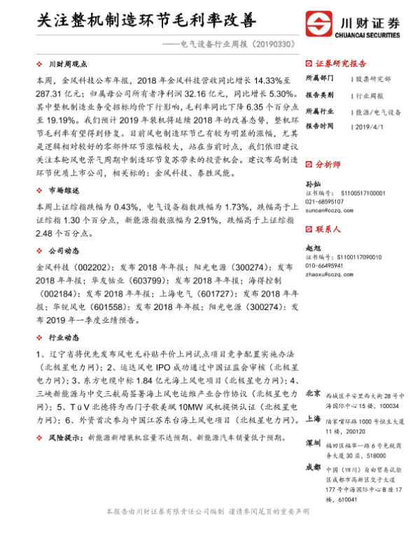 【川财证券】【20190401】电气设备行业周报:关注整机制造环节毛利率改善-10页 行业研究