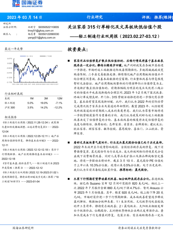 【国海证券】【20230314】轻工制造行业双周报:关注家居315订单转化及文具板块低估值个股-28页 行业研究