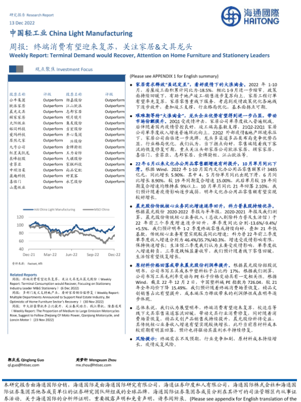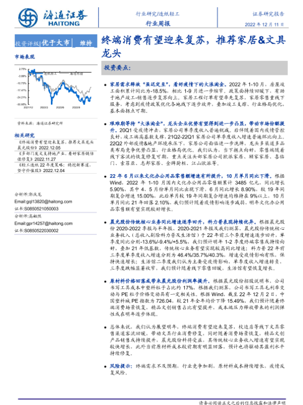 【海通国际】【20221213】中国轻工业周报:终端消费有望迎来复苏,关注家居&文具龙头-20页 行业研究