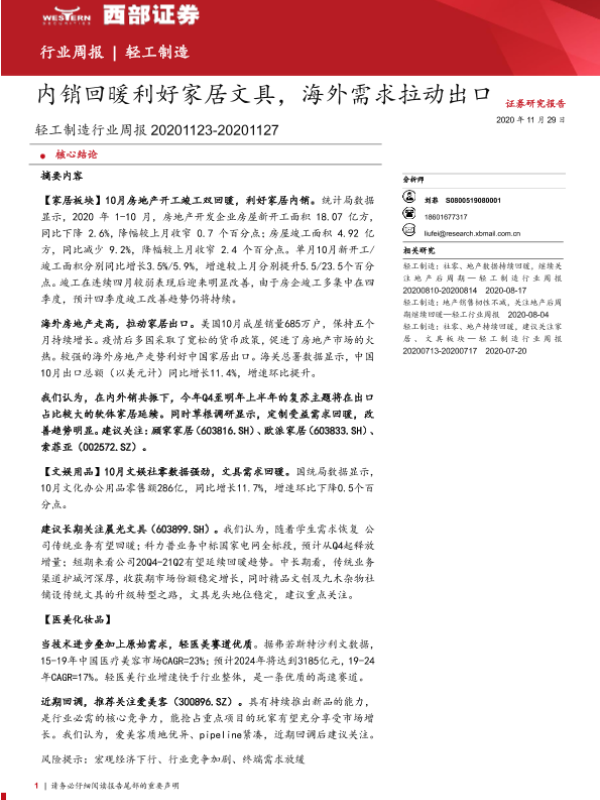 【西部证券】【20201129】轻工制造行业周报:内销回暖利好家居文具,海外需求拉动出口-12页 行业研究