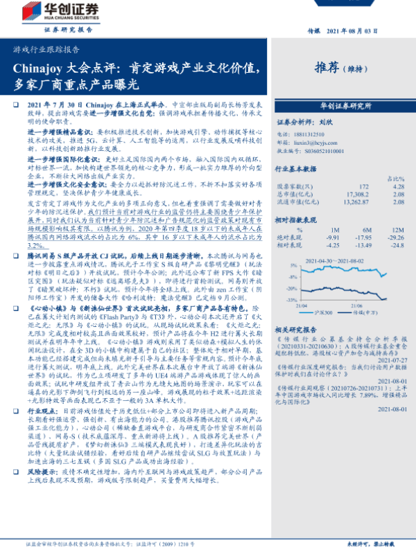 【华创证券】【20210803】游戏行业跟踪报告-Chinajoy大会点评:肯定游戏产业文化价值,多家厂商重点产品曝光-4页 行业研究