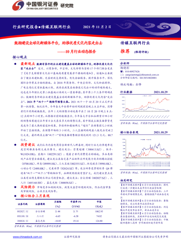 【银河证券】【20211102】传媒互联网行业10月行业动态报告:鼓励建设全球化新媒体平台,助推优质文化内容走出去-25页 行业研究
