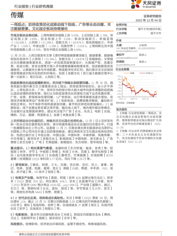 【天风证券】【20221204】防控政策优化或推动线下院线、广告等业态回暖,关注数据要素、文化国企板块持续催化-12页 行业研究